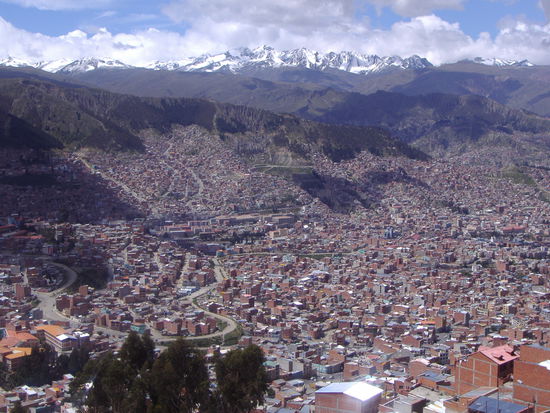 An unserem letzten Tag in LaPaz, einem Sonntag, wollen wir die Feria in ElAlto, eine Art Vorort von LaPaz, am oberen Rand des Kessels, besuchen. Das ist ein riesiger Markt, auf dem es offenbar alles gibt, beziehungsweise alles in weniger als 5 Minuten beschafft werden kann. Wir schlafen erstmal aus, versuchen erfolglos Bustickets nach Uyuni zu bescheffen (Mittagspause...) und nehmen dann einen der kleinen weissen Minibusse nach ElAlto. Von hier oben hat man einen fantastischen Ausblick auf den Stadtkessel.