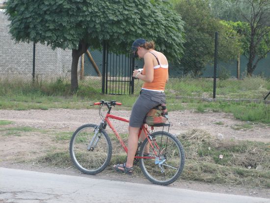 Nachdem wir sämtliche Weine probiert haben, geht's weiter. Leider ist die Radtour nicht so schön wie erwartet. Sie führt uns nicht mitten durch die Weinfelder, sondern demonstriert uns die Vorzüge einer echten Argentinischen Landstraße, über die ein Laster nah dem anderen donnert. Unter anderem werden hier auch die Arbeiter von den Weinbergen hin und her kutschiert. Und die lernen heute die Vorzüge von Fahrrädern kennen, deren Sättel höher liegen als die dazugehörigen Lenker, insbesondere wenn die Fahrrin wie ich ein nicht allzu üppiges Oberteil trägt. Das gejole und gepfeife fasse ich durchaus als (Lärm-) belästigung auf! So gondeln wir also entlang der Hauptstraße von Weingut zu Weingut.