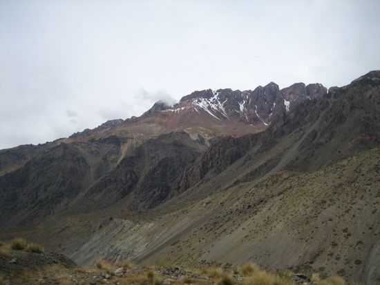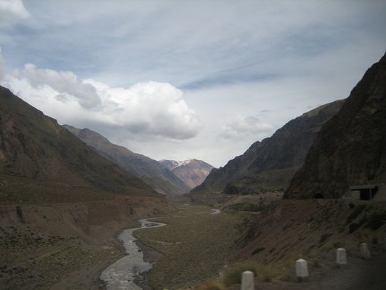 Eine weitere Touristenatrakrion in der Nähe von Mendoza ist die so genannte Puente del Inca. Das wollen wir uns natürlich auch nicht entgehen lassen. Aber das ganze als geführte Tour ist uns zu teuer und nach dem Pauschaltouristenprogramm der letzten Tage wollen wir uns auch mal wieder ein bisschen wie echte Abenteurer fühlen. Deswegen machen wir uns auf eigene Faust auf den Weg. Wir fahren früh morgens zum Bushof (das Busfahren in Mendoza haben wir inzwischen besser drauf) und besorgen uns Tickets in das Tal, in dem die natürliche Brücke liegen soll. Schon eine Stunde später geht's los. Endlich sitzen wir mal wieder in einem Gammelbus, wie wir es aus den meisten anderen Ländern unserer bisherigen Reise gewohnt sind. Schon bald verlässt der Bus die Stadt und wir kommen den schneebedekten Bergen immer näher.