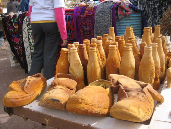 An den kleinen Ständen vor der Brücke kann man alle möglichen gegenstände kaufen, die die Standbetreiber unter das sehr kalkhaltige Wasser gestellt haben, weswegen die Dinge in sehr kurzer Zeit komplet mit dieser gelbbraunen Schicht überzogen werden.