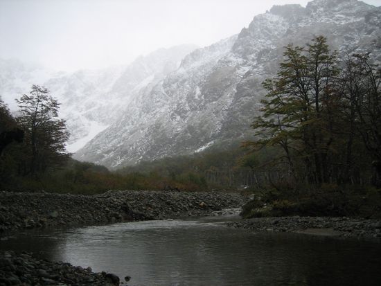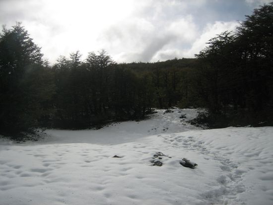 Am nächsten Morgen führte uns der Weg zunächst noch etwas weiter bergauf, was sehr steil und rutschig was. Je höher wir kamen, desto mehr Schnee gab es. Wir kamen an einem kleinen See vorbei bevor es wieder bergab ging. Der Abstieg glich mehr einer Rutschparti und ich hatte eher das Gefühl ski zu fahren, als zu wandern, was mir eigendlich ganz gut gefiehl, aber Helena fand das ganze nicht so lustig und kam aus dem Fluchen nicht mehr raus: "Das ist das beschissenste was wir auf der ganzen Weltreise gemacht haben!"