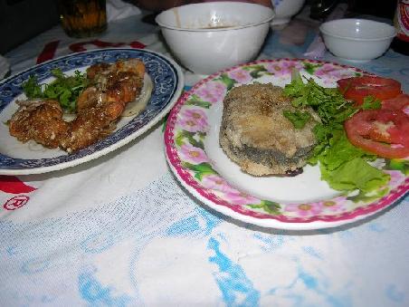 Da es schon recht spät war und wir heute noch nichts gegessen hatten gingen wir ins Hong Phat zum Abendessen, die unserem Hotel am nächsten gelegene LP Empfehlung. Dies stellte sich wieder einmal als halbleeres Hole-In-the-Wall Lokal mit englischer Speisekarte und unfreundlichem Service heraus, unverständlich wo es hier doch überall so viele nette Open-Air Lokale voller Einheimischer gibt. Das Essen war okay aber für Vietnam unterdurchschnittlich und schien mir sehr chinesisch beeinflusst. Die gebratenen Garnelen (25.000 d) waren gut, aber der Tintenfisch (20.000d) kam in einer für Vietnam schier undenkbar faden, geschmacksneutralen Soße ohne Kräuter. Billig, aber nicht unbedingt empfehlenswert.