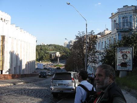 Etwas oberhalb kommt man in einen Park am Steinhang zum Dnjepr. Und hier haben wir nun den Blick weit über das Tal, das die Metropole mittendurch schneidet. Der Dnjepr bildet mehrere Inseln und teilt sich in zahlreiche Arme, deren größter schiffbar ist. Über das Ganze wird eine lange neue Brücke gebaut, die die Satellitenstädte im Osten mit der Weststadt verbinden wird, dieses Panorama halten wir fotografisch fest, den östlichsten Punkt unserer Reise werden wir so in Erinnerung behalten, wir befinden uns hier etwa 1100 km Luftlinie nördlich von Istanbul und 1200 km südlich von St.Petersburg, 600 km südwestlich von Moskau und nur 550 km ostnordöstlich von Lemberg, 450 km nördlich von Odessa. Sergej zeigt uns noch den Platz und das Gebäude, in dem die orangefarbene Revolution 2004 ihren Anfang nahm. Bis jetzt hat man noch keine Gedenktafel hier errichtet. Dann schlendern wir durch die Einkaufsmeile Kievs, in der man alles angeboten bekommt, und es muß auch Leute geben, die sich des Einkaufen hier leisten können.
