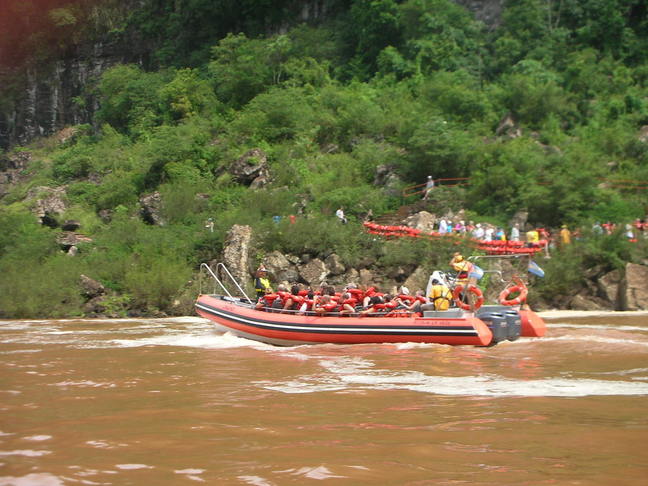 Heute standen wir um 9 Uhr auf,und fruehstuckten im Hote. Anschliessend gingen wir zum Busterminal, kauften das Busticket fuer Morgen nach Rosario, fuer 120 Pesus, also, ca. 50 Chf. Ja wir sind jetzt hald in Argentinien, wo der <lebensstandart hoeher und teurer ist, dafuer ist es zivilisierter, was fuer uns ein grossser Segen ist. Denn wenn man solange keine oder nur wenig Zivilsation hat, geniesst man sie um so mehr, denn fuer euch in der CH, ist das ja normal. Vorallem, das Essen, ich meine natuerlich die Staks, und erst noch nicht bien cuit, sondern schoen seignion, sind supper, dazu noch genuegend Strohm, normale Hotels,und voralem konfortable Busse einfach schoen. so jetz wieder zum Tag.. Dann kauften wir das Billet zu den Wasserfaellen, und ein Billet, fuer eine Tour. So dann fuhren wir mit dem Colektio zum Nationalparkeingang, wo wir noch 30 pessos bezahglen mussten. Dann hiess es um 10 uhr startet die tour, doch auf meiner Uhr war es Elf.Dann merkten wir das wir wieder eine Stunde weiter weg sind von Europa, komische Sache, denn Braslien liegt ja auf der gleiche Seite.. egal. dann fuhren wir mit einem offenen Touristen jungel Buss, durch den Jungel. Die anderen Touristen waren die meiesten Argetinier, denn die haben gerade Ferien. Als wir beim Wasser ankamen stiegen wir ins Boot um. Wow, das war fantastisch, wir fuhren zu den grossen Iquasufaellen, und sogar ein weniger darunter. Wie Ihr euch denken koennt waren wir pflotsch nass, aber bei 34 Grad ist das ja egal, oder tut sogar gut. Da es so nass war koennten wir nur wenige Phots mache, aber ich bekomme noch eine DVD. Uebrigens zuerst wollte ich ja mit dem Helikopter darueberfliegen, weil mir das alle empfohlen haben, aber da es seint 1998 ein Nationalpark ist duerfen die auf argetinischerseite gar nicht fliegen und auf brasilanischer, schon, aber nur von weit weg, also bringt es nicht viel, dazu kommt das es nur 10 Min. ginge und 60 Dollar kostet. ALso voll zufrieden und pflotsch nass, spazierten wir durch den Jungel den Faellen entlang. Um ca. 13 Uhr nahmen wir ein offenes Zueglein das uns wieder zum Ausgang fuer. Fazit; Wer die Moeglichkeit hat dieses Naturhighlight zu bestaunen soll dies unbedingt machen. Dann gingen wir zurueck ins Hotel, ruhten uns aus, gingen schwimmen, und freuten uns auf das Steak, am Abend.