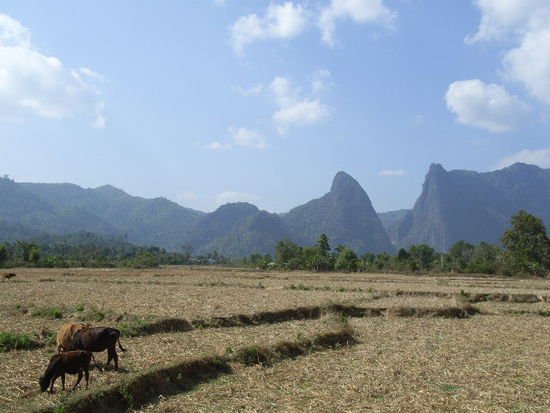 die naechste busfahrt ging vers le sud a direction du vang vieng. vang vieng war fuer mich ein zweischneidiges schwert. ein kleines staedtchen welches unzaehlige gasthaeuser und hotels beherbergt, gelegen in einer fantastischen landschaft, die mit vielen naturschoenheiten glaenzt. dutzende von hoehlen, eine sehr spezielle form von bergen genannt karstfelsen, ein tuerkisblauer fluss blue lagoon genannt, was absolut zutreffend ist und entlegene doerfer mit vielen vielen kindern.