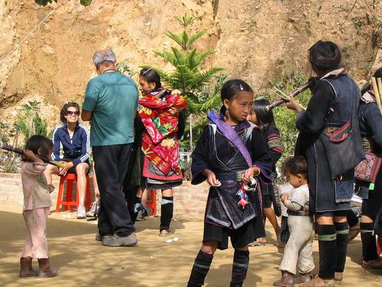 3 Stunden spaeter , frisch geduscht, holte mich dann mein Guide ab. Meine "Gruppe" bestand aus nur zwei Personen - Mosche aus Israel und mir. Die Dritte, eine Spanierin hatte leider ihre Schuhe in Hanoi vergessen und kam mit dem Moped nach. Unser Tourguide, eine junge Hmong sprach hervorragend verstaendlich englisch , was uebrigens fuer alle lokalen Tourguides hier gilt. (im Gegensatz zu den vietnamesischen, bei denen man sehr gut hinhoeren muss).