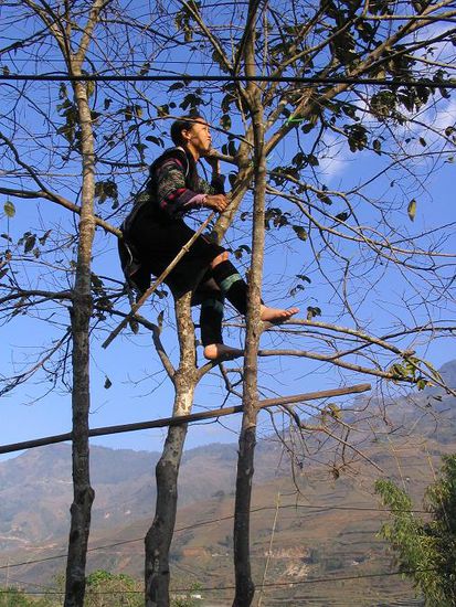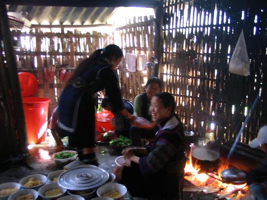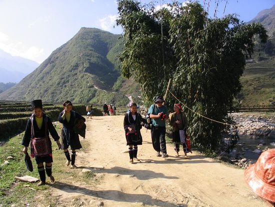Ich habe drei Tage Sapa gebucht. Es ist uebrigens wirklich guenstiger das hier vor Ort zu tun. Je nachdem wieviel Geduld und Zeit man fuer Preisvergleiche hat, kann man 3Tage/4 Naechte Sapa ab 100 $ bekommen. Schlafwagen (Softbett),Hotel, Verpflegung und Tourguide eingeschlossen. OK, wer mehr rechnen muss kann sich sein Ticket auch selbst kaufen und Hotel und Guide in Sapa buchen, was am Ende sicher viel guenstiger ist. Ich bin trotzdem froh, alles in Hanoi klar gemacht zu haben, da ich mir nicht sicher bin,ob ich sonst den Bahnhof (Eingang zwischen zwei Marktstaenden) und den richtigen Zug gefunden haette. Morgens 5 Uhr dann in Lao Cai grosses Chaos. Welcher der vielen Busse nimmt mich mit nach Sapa ? Ich haette mir wenigstens den Namen des Hotels aufschreiben lassen sollen. Irgendeiner der Busfahrer war dann aber der Meinung, dass ich wohl in seinen Bus gehoere und lud mich 1/2 Stunde spaeter in Sapa vor dem "Royal Mountain View" Hotel ab. Dort suchte ich meinen Namen immer noch vergeblich.Aber halt - letzte Zeile "geb. Schramm" . Das koennte ich sein. Offensichtlich hatte die nette junge Frau im Reisebuero einfach irgendeine Zeile meines Reisepasses als Namen identifiziert statt mich zu fragen. (Spaeter wurde im Hotel dann daraus einfach nur noch "geb." )