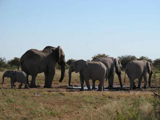 Mit dem eigenen Auto auf Safari zu gehen, ist schon speziell. Wir haben versucht, jeweils kurz nach Sonnenaufgang die ersten Wasserlöcher anzusteuern. Bei einem trafen wir eine 20-köpfige Elefantenherde, bei vielen anderen war aber kaum was los. Am Meisten haben wir jeweils vom Pistenrand aus beobachten können. Wenn da irgendwo schon ein Mietwagen stand, gab's bestimmt Löwen oder ähnliches zu kucken...