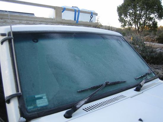Die Naechte waren so kalt, dass die Scheiben des Autos frueh von innen und aussen mit Eis beschlagen waren.