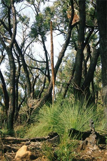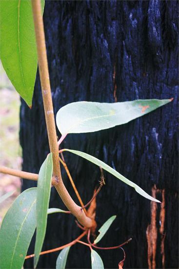 Die verbrannte Region erholte sich jedoch schnell und man kann nun sehen wie aus den verbrannten Eukalypten neues Leben spriesst. Anders als bei unseren Waeldern sterben die Baeume nach dem Feuer nicht ab, sondern sie nutzen das Feuer um in aller Pracht neu zu ergruenen. Auch fuer die Fortpflanzung der Grasbaeume ist das Feuer ueberlebensnotwendig. Fuer die Menschen in dieser Gegend jedoch muss es ein Alptraum gewesen sein.