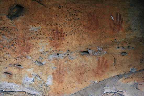 Shelter ist ein natuerlicher Unterstand der vor Regen schuetzte. Viele Generationen von jungen Leuten haben dort mit rotem Ocker den Abdruck ihrer rechten Haende auf dem Stein hinterlassen. Viel Wissen ueber diese Kunst ist heute verlorengegangen.
