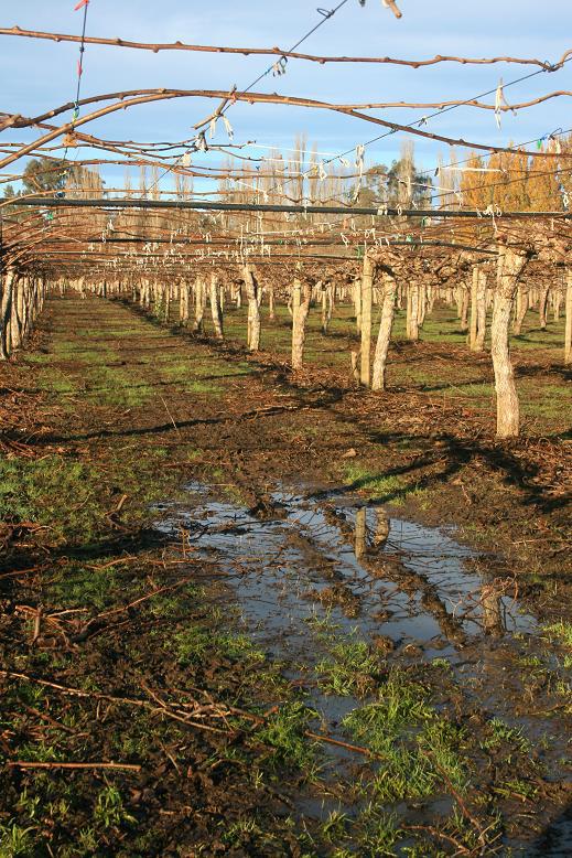 Der erste Schritt beim Kiwipruning besteht darin die Baeume zu entlauben, voher sehen die Felder noch so schoen aus: