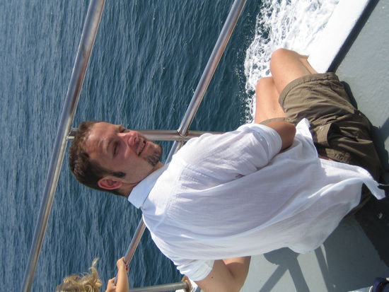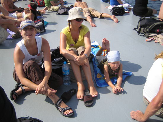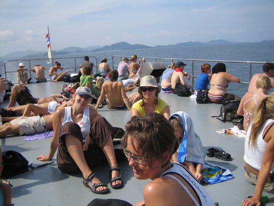 So letzter Tag im Luxus. Nachden wir mit den Eltern ein letztes Mal gefruehstueckt haben, haben wir schnell die Taschen gepackt und sind nochmal runter zum Pool. Die Weiterfahrt haben wir am Vortag klar gemacht. Also runter an den Pool. Nicht lange liegen, denn wir hatten uns vorgenommen heute mal Jetski zu fahren. Also zwei Jetskis organisiert und los gings. Halbe Stunde fuer dreissig Euro. Nicht billig aber es war jeden Cent wert. Danach war es auch schon 11.00 Uhr. Da der Pickup zwischen 12.00 und 12.30 Uhr kommen sollte, mussten wir langsam mal auschecken da es ja vielleicht doch nach dem ganzen Hin und Her etwas laenger dauern koennte. Gut das wir so frueh angefangen haben, denn dass Auschecken dauerte ewig. Der Pickup war schon da und musste bestimmt noch 10 Minuten auf uns warten. Also schnell und schmerzlos verabschiedet und ab in den Minibus. Noch ein paar Andere abgeholt und dann ging es zum Pier. Dort war ein kleiner Hotel booking Stand an dem wir fuer die erste Nacht ein Zimmer fuer 30 Euro gebucht haben. Die Ueberfahrt war ziemlich anstrengend da wir leider zu spaet gemerkt haben wie heiss die Sonne doch an dem Tag war und erst zu spaet, kurz vor dem Sonnenstich, unter Deck gegangen sind. Auf Phi Phi angekommen war ein Mitarbeiter vom Hotel da, der unsere Taschen auf einen Handkarren geladen hat und uns zum Hotel gefuehrt hat. Zimmer waren sauber, erste Mal Klimaanlage und ein Fernseher (jetzt mal vom Hotel abgesehen). Sind dann Nachmittags noch ein bischen rumgelaufen und haben zu Abend gegessen. Um 20.00 Uhr haben sich D+D und Ben dann ins Bett verabschiedet. Wir sind noch ein Stuendchen ins Internet gegangen und haben endlich die Fotos eingestellt. Sind dann auch so gegen neun Uhr sehr muede ins Bett gefallen.