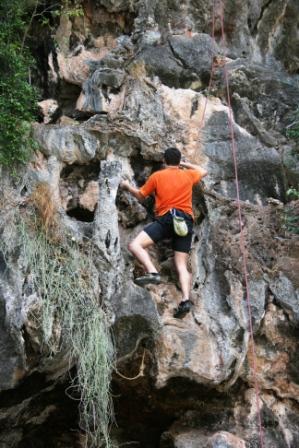 was für ein Tag, was für Eindrücke und was für geschundene Muskeln und Knochen. Aber erstmal der Reihe nach, heute durften wir erstmal ein bissle länger schlafen da uns Boo von den Tex Rock Climbers erst um halb zehn erwartete. Im Laden angekommen begrüßte uns erstmal ein richtig freundlicher und unkomplizierter Thai. Er reichte jedem von uns ein Gürtel, ein paar Schuhe - ich weiß jetzt warum manche Frauen nicht so gut auf hohe Schuhe zu sprechen sind, waren die Eng und unbequem. Gott sei's gedankt dass wir die nur zum Klettern tragen mussten und sonst ausziehen durften. Zu guter letzt gab's noch ein Säckchen mit Kreide bevor es dann zu einem kurzen Fußmarsch an die Felswände losging. Am morgen kletterten wir in Railay East an verschiedenen Wänden und schwierigkeitsgraden. Die Zeit verging wie im Flug und wir hätte nicht gedacht das wir schon am Morgen so Höhen erklimmen würde ca. 25m. Kurz vor der Mittagspause bot sich mir dann noch die Chance einen härteren schwierigkeitsgrad zu Meistern. Nach kurzem schauen und einem fragenden Blick an Boo, sagte er probiers einfach wenns nicht klappt kann ich jederzeit aufhören. Der Anfang gestaltete sich noch leicht, aber auch nur die ersten 10 Meter. Auf einmal fehlten die Löcher und die großen Steine zum festhalten in der Wand. Wie Spiderman, (wer ist das überhaupt) hangelte ich mich bis auf dreißig Meter hoch dann verließen mich Kurz die Kräfte und ich musste mal kurz Pause machen. Meine Muskeln sagten nein, irgendwie wollten sie nicht mehr. Nun dachte ich mir du bist so weit gekommen und jetzt gibst du auf? Ich mobilisierte noch mal alle Kräfte und wagte die Letzten 10m noch hoch. Total fertig touchte ich den Ring am Ziel mit letzter Kraft und ließ mich Fallen. Wieder festen Boden unter den Füßen hieß es dann erstmal Pause. Im Hotel angekommen gings erstmal unter die Dusche, war das gut. Dann gab's noch nee Kleinigkeit zu essen und um halb zwei standen wir schon wieder bei Boo im Laden. Dort rüsteten wir uns wieder aus und machen uns zu einem 20 minütigen Marsch auf, der uns auf die andere Seite der Insel dem Phranang Strand brachte. Dort angekommen absolvierten wir noch nee warmmach Übung bevor es dann zu einer Höhle gehen sollte. Als wir dann durch dunkle Gänge kletterten und die Höhle in 80 Meter über dem Meeresspiegel erreichten boten sich uns atemberaubende Bilder. Hier kletterten wir dann nicht weiter sondern seilten uns 35 Meter nach unten ab. Wieder auf Muttererde angekommen fragte uns Boo dann ob wir noch wollen oder nicht mehr. Stefan musste verletzungsbedingt aufhören da er eine offene Blase an der Hand hatte. So meisterte ich also vielleicht alleine die neue Herausforderung? Ich sicherte Boo während er in 50 Metern Höhe das Sicherungsseil anbrachte. Nachdem er wieder unten war machte ich mich dann an den Aufstieg und es war schweißtreibend, aber nach ca. 15minuten erreichte ich mein Ziel in 50 Metern Höhe und hatte abermals einen super Blick über die Railaystrände East und West. Nach kurzem genießen machte ich mich wieder an den Abstieg. Das ist wie in den Filmen wenn sie sich mit beiden Beinen wo abstoßen und dann schnell in die Tiefe sausen, das macht irre viel Spaß. Nachdem wir dann alles zusammen gepackt hatten schleppten wir unsere müden Körper noch ein bissle durch unwegsames Gelände bevor wir dann am Railaystrand West rauskamen. An der Felswand trafen wir noch ein paar Leute aus Berlin und Dresden. So fand der Klettertag dann sein Ende und um Fünf waren wir wieder im Hotel unter der Dusche. Am Abend gönnten wir uns dann noch nee Thaimassage bevor wir dann total am Ende und müde ins Bett vielen. Am Freitag geht es dann weiter nach Ao Nang wo wir dann häufiger Berichte Online schreiben können denn auf Railay ist das so nee Sache mit dem Internet.