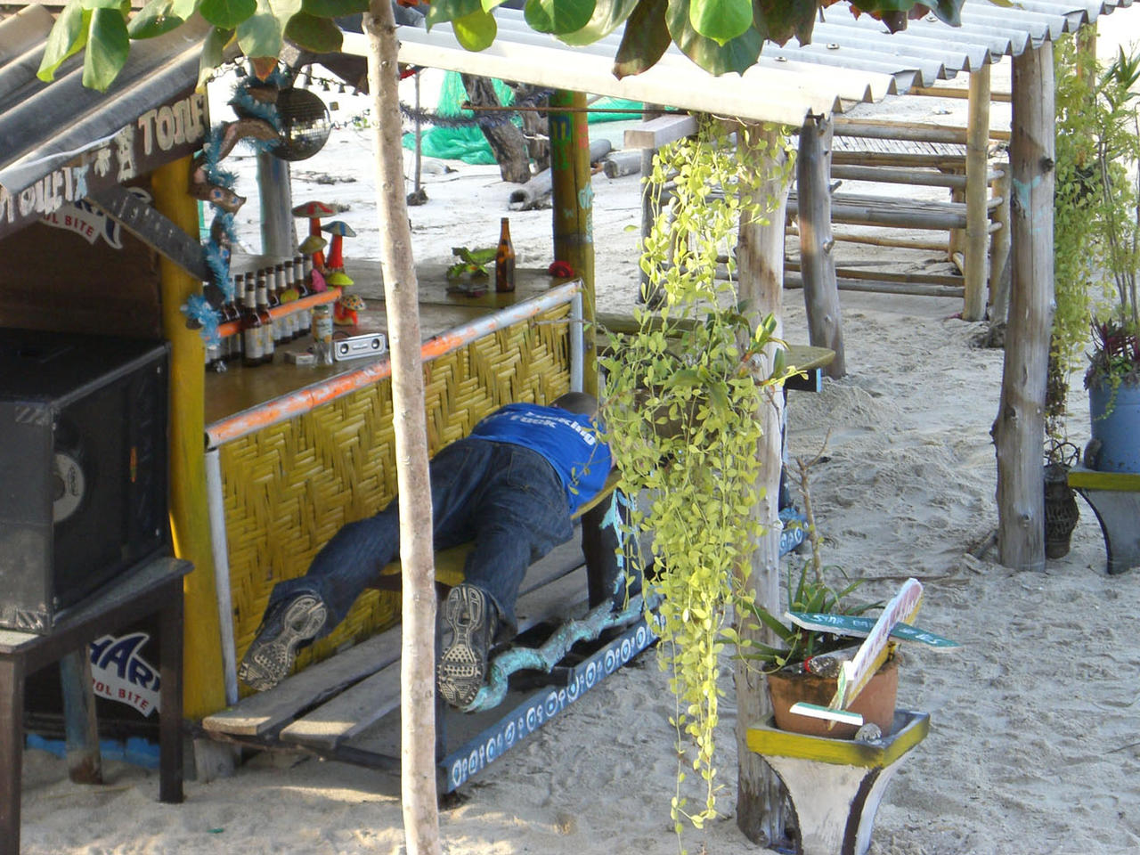 Am Nachmittag bin ich dann mit dem Katmaran bei massivem Seegang nach Phnagan gefahren (aus Phi Phi Island ist leider nichts geworden, weil aufgrund des anhaltend starken Seegangs keine Boote direkt zum Festland gegangen sind). Am Bott ist mir Gerald aus Suedafrika ueber den Weg gelaufen. Auf Phangan angekommen haben wir uns gemeinsam eine Unterkunft gesucht und schliesslich eine Anlage mit dem positiven Namen "Happy Bungalow" gefunden (wie jeder weiss buergt happy stets fuer Qualitaet). Gut, super schoen ist es dort nicht, aber der Relaxfaktor liegt bei 100 Prozent. Haben im Restaurant eines Hollaenders was zu essen bestellt. Der meinte, wir muessten ein bisschen waren, seine Frau sei gerade einkaufen und er sei nur im Stande Eier oder Toasts zuzubereiten. Viel spaeter wieder zurueck bei unseren Happy Bungalows haben wir einen Typen ( ca. 50 Jahre) der in der Haengematte vor seiner Huette gehaengt ist, gefragt, wo man denn hier am besten am Abend feiern geht und wo richtig was los sei. Seine Antwort: I was born to lie in the sun...Hier bin ich richtig!