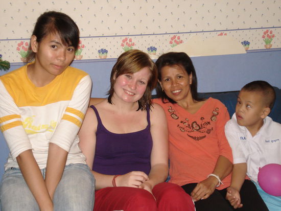 an diesem ersten Abend kam die Freundin von Todt vorbei, habe ihren namen leider wieder vergessen, und auch Pat oder Pot war da... das sind die beiden anderen Soehne und es sind eineiige zwillinge, ich hatte keine ahnung wer wer ist und an dem abend lernte ich den einen kennen, am naechsten morgen sass der am pc und ich dachte es waere der selbe, aber irgendwie wars sein Bruder, und ich habs erst gemerkt als seine Mutter kam und meinte oh ich sollte euch wohl einander vorstellen...aehm ... peinlich peinlich... aber zurueck zum essen... habe was gelernt : keinen papaya salat essen!, sieht gut aus ist aber wahnsinnig scharf, echt schlimm!!!brauchte nach einem bissen mindestens ein glas wasser um wieder normal reden zu koennen, ansonsten essen die menschen hier mit loeffel und gabel, messer gibts soweit ich das gesehen hab nicht, etwas ungewoehnlich.. ausserdem wird manchmal auch nur mit den Haenden gegessen, wenn es "sticky rice" gibt der ist so klebrig das er wie ein klumpen ist, und mein reisst sich dann kleine mundgerechte Stuecke davon weg, formt sie zu einer Kugel und ist ... macht echt s pass...werde ab jetzt immer so essen!!!
