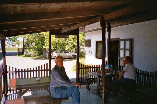 Der Wirt sorgt für Getränke, das Essen kommt aus unserer Futterkiste. Endlich wird auch das erste Foto geschossen, denn die Sonne begrüßt uns wieder. Unsere Futterkiste füllen wir in Snina in einem Supermarkt noch einmal üppig auf, wer weiß, ob das "drüben" so noch möglich sein wird.