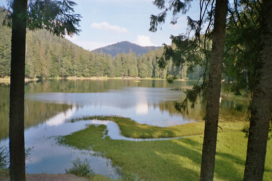 Was ich an Hand unseres spärlichen Kartenmaterials befürchtet hatte, kommt nun auf uns zu: In Mizhir'ya biegt das Flußtal nach Süden zur Theiß ab, wir wollen nach Osten und müssen in die Berge. Die Straße wird enger und schlechter, aber vor allem steiler. Hoch über uns, mindestens 400 Meter höher, sehe ich auf einem Berg ein großes Haus, ein Hotel, von dem aus man einen herrlichen Blick auf die höchsten Berge des Naturparks Waldkarpaten haben soll, deren höchster, die Hoverla, über 2000 Meter hoch ist. Die ersten 200 Höhenmeter treten wir uns verbissen in die Höhe, dann wird die Steigung 12 % und Horst stellt den Opel einladend mitten in eine Kehre und zeigt auf den weiteren Aufstieg. Wer kann da widerstehen ? Zumindest bis auf die Paßhöhe sind wir bereit, uns im Auto kutschieren zu lassen. Doch unterwegs - Steigung und Straßenzustand werden immer bedenklicher- wird uns klar, dass selbst die Talfahrt auf der anderen Seite mit dem Rad höchst gefährlich werden würde. Im Schritttempo umfährt Horst manche Mondlandschaft aus Schlaglöchern, die ohne Vorwarnung plötzlich auftauchen. Oben auf der Paßhöhe gibt es eine zugewachsene Zufahrt zum Hotel, das Hotel ist von einem Baugerüst umgeben, aber weit und breit niemand zu sehen. Im übrigen weht es ungemütlich kalt, hier hält es uns nicht lange. Der Abstieg auf der anderen Seite ist nicht minder steil und an einigen Stellen ist der Hang abgerutscht, Einbahnverkehr ohne dass man die Gegenseite sehen kann, Straßenzustand: waagerechte Geröllhalde. Weil es aber die einzige Straße ist, bin ich sicher, dass wir auf dem richtigen Weg sind. Als wir unten im Tal in Synevyr ankommen, finde ich die Bestätigung: Ein Weg rechts führt weiter Richtung "XYCT" was Huszt an der Theiß heißt, ein Weg links führt als Sackgasse 38 km in die Karpaten zu einem Gletschersee. Diesen Umweg können wir uns nun mit dem Auto gönnen. Und diese Fahrt wird zu einem Höhepunkt an Reisegenuß. Wir fahren ein waldreiches Flußtal hinauf, kommen an einer Sperre vorbei, die das Naturschutzgebiet begrenzt und landen am Ende an einem malerischen kleinen See, der offenbar als ukrainisches Nationalheiligtum verehrt wird, Svynevyrs'ka Poljana. Zu Fuß umrunden wir den See in einer Stunde, dann wird es höchste Zeit, uns eine Unterkunft zu suchen. Die finden wir einen Kilometer weiter unten in einer großen "Tourbasa", in der wir die einzigen Gäste zu sein scheinen. Bier und Essen werden uns serviert, es schmeckt gut, obwohl wir nicht wissen was es ist, eine Speisenkarte gibt es nicht, und selbst wenn, dann hätten wir die auch nicht lesen können.