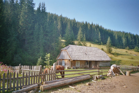Bei U'bla geht es dann in die Ukraine. Wir sind das einzige Auto, das rein will, auf der Gegenseite sehen wir Schlangen von "Tanktouristen". Eine Stunde dauert die Abfertigung dennoch. Sehr genau will man alles sehen, wir haben den Eindruck einer sehr korrekten Abwicklung,, aber auf der ukrainischen Seite ist weder mit Englisch noch mit deutsch viel Verständigung möglich. 100 Meter hinter der Grenze gleich die erste, nagelneue Tankstelle. Das müssen wir testen. Grob gerechnet, kostet hier der Liter Diesel knapp 40 Euro-Cents. Aber man will Cash haben, nachdem wir den Tank haben vollaufen lassen, Visacard zählt nicht, aber Griwna konnten wir noch nicht eintauschen. Was nun ? Der Mann in einem Kabuff hinter einer kleinen Glasklappe fragt uns nach Slowakischen Kronen, die haben wir, und wir zahlen 450 SKK. Lange müssen wir nicht rechnen, um zu dem Ergebnis zu kommen, noch nie so billig getankt zu haben. Außer kyrillischer Schrift auf den Ortstafeln und dichterer Besiedlung unterscheidet sich die Gegend kaum von der Slowakei - doch, hinsichtlich des unberechenbaren Staßenzustandes und oft fehlender Wegweiser, wie wir bald merken werden. Um Griwna aus dem Bankomaten zuziehen, müssen wir extra einen Umweg über Uzgorod machen. Das kostet Zeit, die nun knapp wird. Und noch mehr Zeit verlieren wir, um aus Uzgorod wieder herauszufinden Richtung Mucaceve. Ist man einmal von der Durchgangsstraße abgebogen, erfordern die nächsten Meter vor dem Auto alle Aufmerksamkeit, der Weg kann tadellos sein, aber ebenso können ohne Vorwarnung tiefe Schlaglöcher auftauchen, die man im Schritttempo umfahren muß. Auf vorausfahrende Autos kann man sich nicht verlassen, der Moskwich hat stabile Blattfedern und ist so hoch gebaut, dass er Löcher vertragen kann, die bei unserem Opel womöglich zum Achsbruch führen würden. Und bis wir einen kyrillischen Wegweiser finden und dann auch noch entziffern können, sind wir trotz Tempo 20 schon daran vorbei. Als wir dann die Hauptstraße wiederhaben, beschließen wir, nur auf dieser guten Straße unser Tagesziel, den Ort Polonya anzusteuern. Dort soll es eine Pension FORTUNA geben, wie ich von Herrn Seelig in Neumünster noch weiß, die preiswert und gut sein soll.