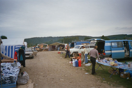 Von Radfahrehrgeiz ist auch heute nicht die Rede, weil von Sonne keine Spur zu sehen ist und ab und zu ein paar Tropfen fallen.So steuern wir erst einmal weitere Kurorte an, und in Jaremca werden wir fündig. Hier scheint es alle Kureinrichtungen zu geben, die vor allem wohl dem Wintersport dienen. Aber außer der Besichtigung einer großen Kirche im unitarisch-ukrainischen Stil zieht es uns schnell wieder ins Auto, denn dort ist es warm. Besonders ich spüre das, denn meinen Pullover habe ich wahrscheinlich auf der Tour nach Auschwitz irgendwo liegen gelassen. Aber auf einem Markt mitten auf dem Feld zwischen Diljatyn und Kolomya kann mir geholfen werden. Für 48 Griwna erstehe ich einen Pullover, den mir das Marktvolk nach langer Suche - auch bei der Konkurrenz nebenan- anbietet. Sichtlich stolz sind die Leute, dass sie mir haben weiterhelfen können, und sofort wird ein Porträtfoto in voller Größe von mir angefertigt. Nun zieht es uns unaufhaltsam Richtung Cernivici-Czernowitz. Die Straße ist so gut, das sie zum Schnellfahren verführt, obwohl 50 vorgeschrieben sind. Das wird uns genau an der Grenze zum Oblast Cernivici zum Verhängnis. Das Ergebnis ist dennoch überraschend: Horst, der Fahrer, wird allein in die Zelle der Polizei genötigt, und dort wird ihm die Tabelle fürs Schnellfahren gezeigt. Zwischen 75 und 150 Griwna (=12 bis 24 Euro) sind fällig. 80 bezahlt er dann, als der Polizist allein mit ihm ist und ohne Quittung. Frohe Fahrt wird uns weiter gewünscht....