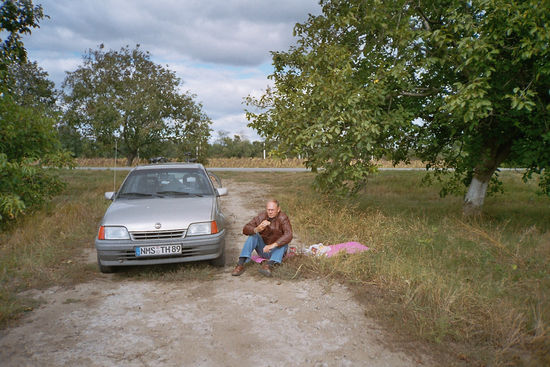 Zunächst betrübt uns das nicht allzusehr außer dem Verlust der schönen Autopiste, aber dann wird uns nicht ganz geheuer: Nach einer Bahnunterführung landen wir auf einem leeren Platz, der völlig von Industieruinen umgeben ist und an jeder Ausfahrt dieses Platzes stehen schwer bewaffnete Soldaten. Wir fragen nach dem Weg nach Odessa, und wortlos wird uns mit einem Fingerzeig der Weg gewiesen. Auf einem Feldweg voller Pfützen geht es durch ein chaotisches Gelände, soviel Industiebrache haben wir noch nie gesehen, und dazwischen keine Menschenseele zu sehen und auch keine menschlichen Behausungen, nicht einmal streunende Hunde. Plötzlich eine scharfe Kurve und ein Polizeikabuff hinter einem Stoppschild. Wir werden angehalten, man will Geld von uns, weil wir das Stoppschild überfahren hätten. Dann folgt Ausweiskontrolle, Dokument Maschin will man sehen, genau werden unsere Gesichter mit den Paßfotos und die Autonummer in den Papieren mit dem Nummernschild verglichen. Man belehrt uns, dass wir hier nicht mehr in Moldawien, sondern in der Republik Transnistrien seien, unsere Transitvisa für Moldawien interessierten sie nicht, für hier brauchen hier neue Transitvisa. An einem Wohncontainer mit einer grün-rot grünen Flagge werden wir 10 Euro los und bekommen dafür eine briefmarkengroße Quittung mit einem Siegel mit Hammer und Sichel. Großzügig erläßt man uns das eigentlich fällige Bußgeld für das Überfahren des Stoppschildes und wir dürfen weiter. In Tinghina ist überall Fotografierverbot, die Zufahrt zur Dnistrbrücke könnte komplizierter nicht sein, ermöglicht aber wohl eine genaue Kontrolle. Vor der Brücke sind martialisch mehrere Sowjetpanzer mit grün-rot-grünen Fahnen aufgebaut, die stolzen Spruchbänder in kyrillisch können wir nicht entziffern. Gibt es denn hier die UdSSR noch ? Ich kann mir einen Schnappschuß aus dem fahrenden Auto nicht verkneifen, mal sehen, was draus wird. Auf der anderen Seite des Dnistr sieht es nicht anders aus als in Moldawien, aber an den Tankstellen sind die Preise in US $ ausgeschildert und uns fallen andere moldawische Autoschilder auf. Und überall so viele grün-rot grüne Flaggen wie in Dänemark die Danebrogs. Hinter Tiraspol kommen wir auch wieder auf die schöne Betonstraße zurück, die hier nun schnurgeradeaus geht und völlig leer ist. So was verleitet zum Schnellfahren, und prompt werden wir auch mit mindestens 160 überholt. Nicht weit danach treffen wir den Überholer in Gesellschaft einer Polizeistreife wieder. Das kann teuer werden, aber nicht für uns! Frohgemuts rollen wir mit 70 weiter der ukrainischen Grenze zu, picknicken noch einmal am Wegesrand in der Steppe, nur noch 100 km bis Odessa. Ob zur Ukraine hin überhaupt Grenzkontrollen sind ? Vor einem sumpfigen Fluß, über den nur eine einzige Brücke führt, rollen wir der immigration control in die Arme. Die ersten fragen uns, ob wir bei der Einfahrt nach Transnistrien etwas bezahlen mußten, wenn ja, das hätten wir uns schenken können, denn das sei nicht erlaubt. Na schön denken wir, dann haben wir wenigstens mit der Quittung ein originelles Andenken. Dann geht's zum Zoll. Dort dassselbe Ritual: Abnahme der Pässe und des Dokument Maschin. Hier wird nach der briefmarkengroßen Quittung gefragt, die wir hier abgeben und nicht mehr wiedersehen. Die Pässe kriegen wir ohne Abstempelung und ohne Ausreisebestätigung aus Moldawien oder Transnistrien zurück, aber auf die Autopapiere läßt man uns warten. Wo denn unsere Einreisebestätigung nach Transnistrien wäre mit Angabe des Kilometerstands unseres Autos. Für das Auto müßten wir noch die Transitpauschale bezahlen. Ich zeige ihm die Quittung, die wir an der rumänisch-moldawischen Grenze für das Autovisum bekommen haben, aber die interessiert ihn nicht, wir seien hier in Transnistrien und nicht in Moldawien. In der Tat laufen die Beamten hier in piekfeinen Uniformen umher, die anders aussehen als die moldawischen. Ohne die Einreisebestätigung keine Autopapiere - fahren Sie zurück nach Tighina und holen sie sich ihre Einreisebestätigung. Er läßt uns stehen und fertigt inzwischen andere Autos ab. Aber um dorthin zu fahren, brauchte ich doch meine Autodokumente, entgegne ich. Das versteht der Mann nicht, mit dem ich mich eben noch tadellos auf englisch verständigen konnte. Da werde ich dann energisch und verlange nach seinem Vorgesetzten. Prompt macht er mir ein Angebot: man kann die Strecke ja schätzen, die wir durch Transnistrien gefahren sind, für, sagen wir 20 Euro könnte er mich durchlassen. Die zahlen wir dann zähneknirschend, aber ich verlange eine Quittung dafür. Die bekomme ich "selbstverständlich". Und wieder bekommen wir einen Wisch mit Hammer und Sichel, den Horst sofort seiner Andenkensammlung einverleibt. Doch am Schlagbaum holt uns die Realität ein: Dokument will man haben, nicht Dokument Maschin und auch nicht Passport, nur die Quittung. Die muß Horst nun herausrücken. Bevor wir ein Erinnerungsfoto davon gemacht haben, sind wir alle Beweismittel los, mit denen man uns bezahlte Schmiergelder bescheinigt hatte, ein ausgeklügeltes System. Aber wir dürfen raus! Erleichtert rollen wir im Schrittempo über den Grenzfluß und lassen uns in der Ukraine schon fast wie in einem zivilisierten Land empfangen. Passport ? Dokument Maschin bitte sehr ? Alles schnell und korrekt, dann zum Zoll. Man übergibt uns eine Zollinhaltserklärung zum Ausfüllen, die ich schon von der slowakisch-ukrainischen Grenze her kenne. Nur die hier hat nur kyrillische Buchstaben und soll auch kyrillisch-ukrainisch ausgefüllt werden. Damit habe ich natürlich Schwierigkeiten - doch kein Problem, der Zöllner würde für bare 20 Euro das Ausfüllen für uns übernehmen, nur blanko unterschreiben müßte ich. Ich lehne entrüstet ab und fülle alles in deutsch aus, auch damit ist man zufrieden und nickt freundlich. Ich bin so angetan, dass ich eine Flasche slowakisches Bier unter dem Autositz hervorkrame 