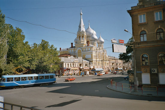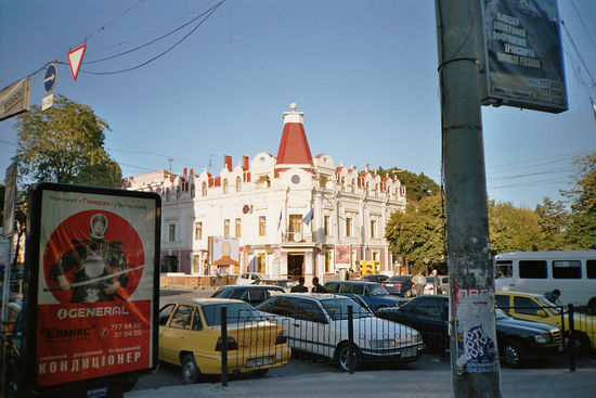 Stahlende Sonne über Odessa! Mit dem Touristenbuch unterm Arm starten wir per Straßenbahn bis an den Rand der City. Wir schließen uns den Menschenmassen an, die ins Kloster St.Panteleymon strömen. In der Kathedrale im zweiten Stock des Klosters werden offenbar Beichten abgenommen, es wimmelt von Popen, die alle sehr beschäftigt sind. Dennoch weist uns einer mit einer einladenden Handbewegung den weiteren Weg in die Kathedrale. Die Luft hier ist zum Durchschneiden, lange hält es uns nicht und wir schlendern zwischen schattenspendenden Platanen nach Nordosten auf das Opernhaus zu. Hier ist Odessa vorzeigbar: ein fast fertig restauriertes prächtiges Gebäude, die nächste Vorstellung--Verdi Aida - ist erst übermorgen, daneben das Museum der Schwarzmeerflotte und ein Stadtmuseum. Irgendwo muß auch ein Standesamt sein, in dem am laufenden Band getraut wird. Überall parken übertrieben lange Luxuslimousinen aller Jahrgänge, aus denen Hochzeitsgesellschaften zum Foto herausquellen. Ein festes Ritual wie in Czernovitz: Ein Foto vor der Oper, eins am Marinedenkmal, eins an der berühmten Potiemkin-Treppe von Odessa mit prächtigem Blick über die Bucht und den Hafen. Hier hat man einen neuen Fährterminal gebaut mit einem Viersternehotel, das das gesamte Gelände überragt. Wir schlendern durch die Empfangshalle des Terminals und zu meinem Erstaunen sehe ich die angezeigte Außentemperatur: nur 13 Grad mittags um 13.30 Uhr, kein Wunder, dass ich mich in T-Shirt und kurzer Hose in der Sonne wohler fühle als im Schatten. Sogar einen Yachthafen gibt es hier, in dem ein paar mondäne Motor- und Segelyachten liegen, Heimathafen Odessa. Wir machen eine Hafenrundfahrt mit, die mit lauter Beschallung in die Bucht hinaus führt. Vom Hafen wird nicht viel vorgezeigt, aber der Blick von See auf die Stadt ist beeindruckend. Odessa ist eine ganz grüne Stadt, von weitem sieht man nur wenige Häuser aus einem Meer von Bäumen herausragen.
