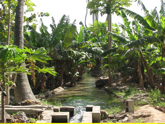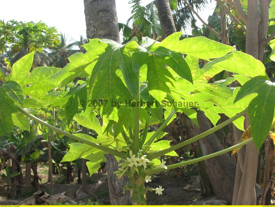 Hier ist die Dreitetagenwirtschaft deutlich zu erkennen. Die Mango/Papayabäume scheinen ähnlich wie die Zitrusfrüchte mehrfach im Jahr Früchte zu tragen, denn einige haben reifende Früchte und andere gelbe Blüten. Die Kokospalmen hängen z.T. noch voller Nüsse und die Bananenstaude knicken von der Last der Fruchtstände z.T. um. Von einem solchen nehmen wir uns noch grüne Bananen mit und wollen sie im Wage reifen lassen.