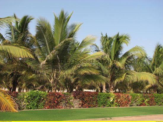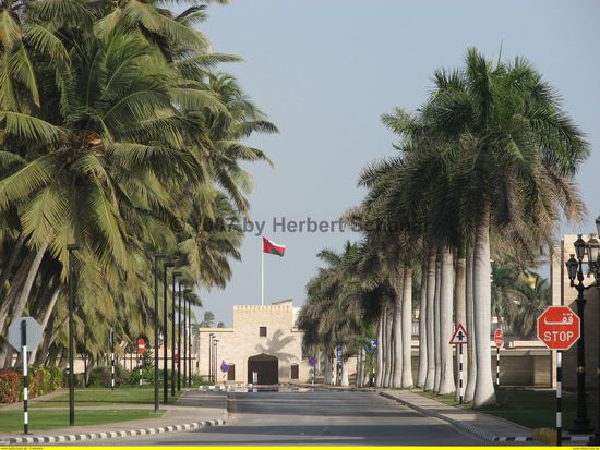 Am Palast des Sultans vorbei, von dem aber fast nichts zu sehen ist als nur eine lange Mauer und ein paar Türme und ein kleiner höchst gepflegter Park mit farblich abgestuften Hecken fahren wir fahren nach Westen, um in den Khor Salalah (16° 59,634' N // 54° 03,879' E) zu gelangen.