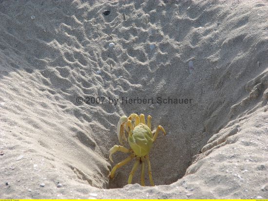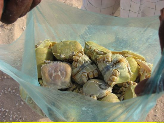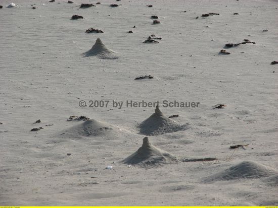 Am Strand bemerken wir so eigenartige Hügel(chen) mit nebenan gelegener Kuhle. Plötzlich krabbelt aus einer solchen eine Art Krebs heraus, schaut um sich und verschwindet wieder. Daher heißt es warten, das scheint auch ein Einheimischer zu tun, denn manchmal sitzt er und dann rennt er ein Stück weiter. Ansonsten ist der Strand menschenleer und man kann bis zur Absperrung des zum Palast gehörenden Strandabschnittes schauen. Unser Krebs lässt sich noch ein paar Mal blicken. Als wir wieder am Wagen anlangen, scheint auch der Einheimische Schluss zu machen. Er kommt mit schwerer Plastiktüte, die er im Süßwasser der Lagune 'spült', zurück und wir befragen ihn. Er hat die Krebsart gesammelt, ihnen die Beine ausgerissen und benutzt sie angeblich nicht zum Essen sondern zum Angeln.
