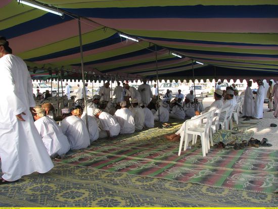 Noch etwas weiter westlich soll nach alter Karte in Old-Salalah ein altes Haus stehen. Auch das müssen wir natürlich suchen. Aber wir finden es nicht und ärgern uns schrecklich, weil wir auf der Straße westwärts nicht wenden können und fast 10 km bis zum nächsten Kreisverkehr müssen, um auf die anderen Straßenseite zu gelangen. Daher sehen wir auch das Salalah-Hilton (16° 58,947' N // 54° 00,888' E), das völlig isoliert weitab vom Schuß am Strand liegt. In dem gewünschten Stadtteil angekommen, finden wir zwar das Haus nicht, aber Ulrike fällt ein großes Zelt auf, an dem viel los ist. Sie bleibt im Wagen, da es sich um einen Männerauflauf handelt. Ich gehe derweil dorthin und frage einen jungen Mann, was denn dort los ist.