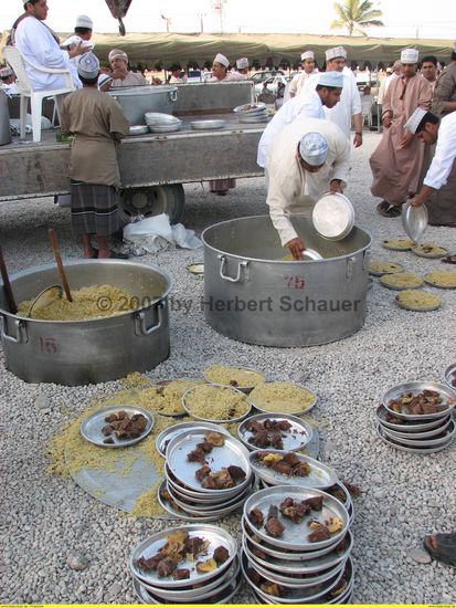 Wegen eines Todefalles in der Familie kommen die Männer dorthin, um ihre 'Brüder' zu treffen. In riesigen Bottichen ist Reis und Fleisch auf dem Pickup hergebracht worden und wird nun verteilt. Da ich natürlich Aussehen errege, werden auch diese Männer auf mich aufmerksam. Sie bieten mir an, im Zelt Platz zu nehmen. Ich erkläre ihnen, dass meine Frau im Auto geblieben ist. Sofort bekomme ich zwei Schalen Reis mit Lammfleisch angeboten.
