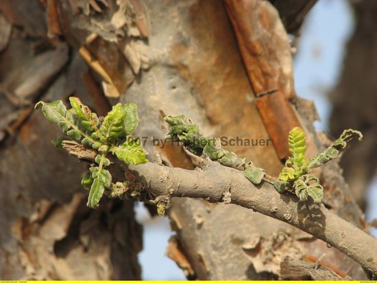 Wir schauen uns ausführlich um, ritzen einen Ast an, der recht bald zu 'bluten' anfängt. Das flüssige weiße Harz riecht kaum; erst wenn es nach einiger Zeit (ein paar Tage?) fest geworden ist, reicht man den typischen Geruch für Weihrauch.