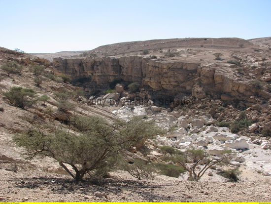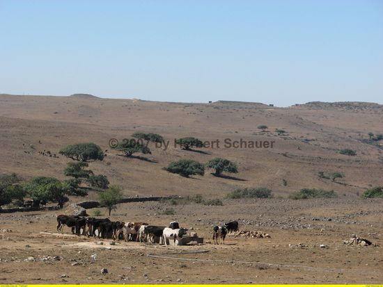 Danach geht es noch in die Ayoun-Schlucht. Bereits bei der Anfahrt wird die Landschaft immer kärglicher und immer häufiger durch kleine Canyons unterbrochen. Trotzdem leben hier noch Jebalis mit ihren Viehherden, die wohl weit über das land ziehen müssen, um Futter zu finden.