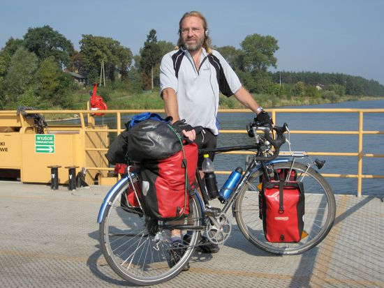 Das Foto zeigt mich beim Übersetzen mit der Fähre über die Weichsel.