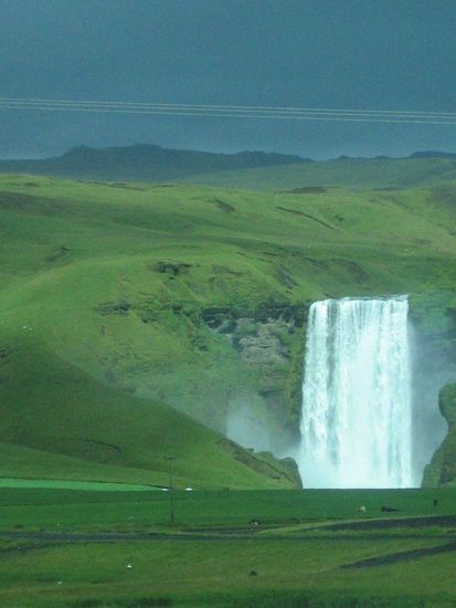 Die Gegend wird immer ländlicher. Grüne Berge steigen zur linken Seite auf und in jeder Ritze bahnt sich ein Fluss den Weg zum Meer. Wir passieren eine Menge kurze und lange Brücken und können eine Menge Wasserfälle ausmachen. Zahlreiche Tiere wie Pferde, Kühe und natürlich Schafe stehen auf den Weiden. Wir erklimmen einen kleinen Pass und können nun einen Blick auf Island's Gletscher werfen, die sich hinter der ersten Hügelreihe in den höheren Bergen verstecken.