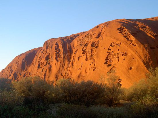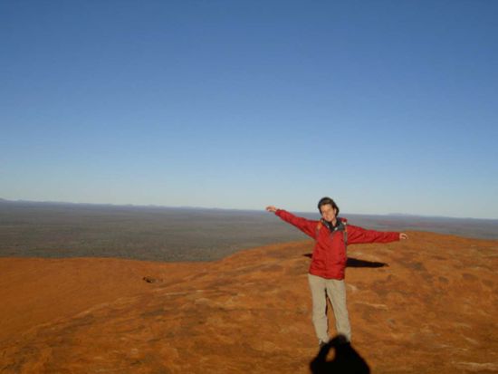 Nach den beschriebenen Kilometern, Rückenschmerzen und großer Euphorie über die herrliche Landschaft, landeten wir pünktlich zum Sonnenuntergang am 17.5.07 am Ayers Rock. Wir genossen die restlichen Sonnenstrahlen und beschlossen die Nacht in Yulara, einem extra für die Touri Meuten angelegten Dorf zu verbringen. Dort lernten wir bei einem Glas Wein eine Gruppe sehr netter österreichischer Mädelz kennen, mit denen wir den Abend verbrachten. Gegen 11 war dann aber auch Bettruhe angesagt, da wir den Sonnenaufgang am nächsten morgen nicht verpassen wollten.