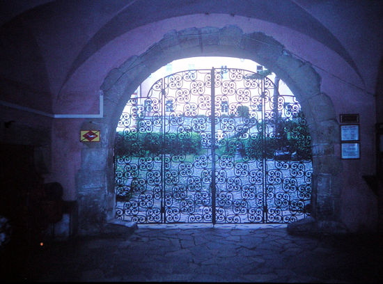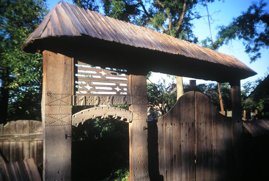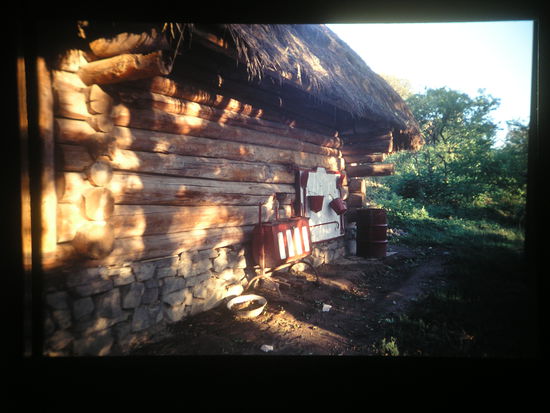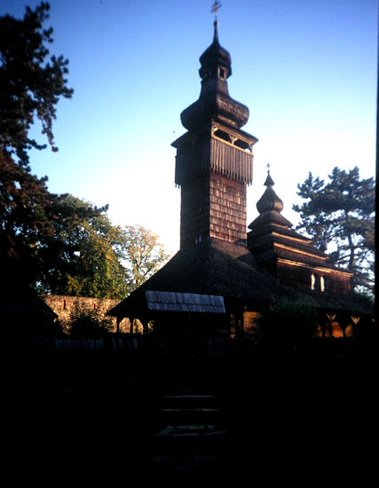 Im Morgengrauen erreichen wir Uzgorod, sogar ausgeschlafen sind wir. Unser Frühstück finden wir in einem 24-Uhr-Laden, dann lassen wir uns beim ersten Tageslicht durch das beschauliche Städtchen rollen. Über die Uz-Brücke zum Theaterplatz, die Philharmonie in einer ehemaligen Synagoge im byzantinischen Stil, dann um den Innenstadtring auf die Burg. Dort schließt der Wachmann seinen scharfen Hund vor uns weg und läßt uns für 2 Griwna die Burg besichtigen. Der Sonnenaufgang bietet fotogene Möglichkeiten, die wir eifrig nutzen, besonders vor der Holzkirche im Dorfmuseum. Gegen 9 Uhr verlassen wir das Museumsdorf, zahlen ein bescheidenes Eintrittsgeld an den Nachtwächter und fahren in nördlicher Richtung aus der Stadt ins Uz-Tal bergauf. Es ist Sonntag, und die Kirchen sind überfüllt. Die Predigt wird auf die Straße übertragen, auch dort knien die Menschen nieder und wir fahren vorsichtig zwischen ihnen hindurch.
