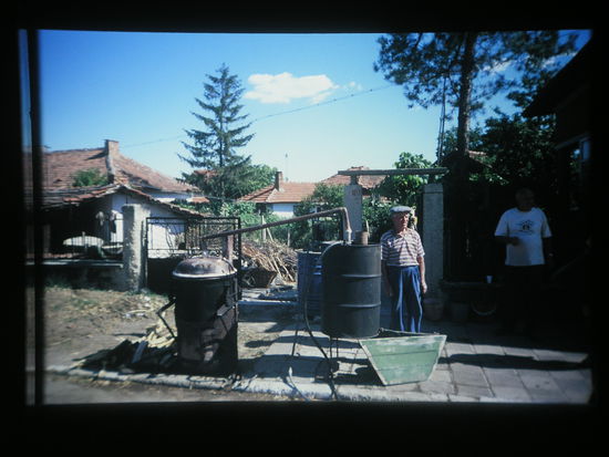 Hier gibt es geschäftiges bulgarisches Landleben zu fotografieren: Eselfuhrwerke fahren die Ernte ein, Kürbisse, Sonnenblumen, Heu und Melonen. Svetan hat schon köstliche Pfirsiche, Lampionfrüchte und Weintrauben für uns eingekauft. Der Clou aber ist ein rauchender Kessel, dessen Dampf abgefangen und destilliert wird. Kaum zu glauben, hier wird auf offener Straße Schnaps gebrannt. Wir dürfen kosten, sogar eine Brandprobe machen, 55 % stark ist der Brand auf jeden Fall. Der Schnapsbrenner posiert für diverse Fotos, danach bekommen wir noch einen direkt aus der sprudelnden Schnapsquelle. Schnapsbrennen ist in Bulgarien jedermann erlaubt, man müsse nur die Vorrichtungen dafür haben, sagt uns Anton. Diese hier funktioniert einwandfrei, einen Mengenkontrolle findet nicht statt - Alkoholsteuer scheint hier also unbekannt zu sein. Da dürfte alles, was wir bisher vorgesetzt bekamen, selbst gebraut und selbst gebrannt gewesen sein. Nun geht es auf Schleichwegen immer hinter Svetans Auto her zu unserem Hotel in Vidin, 92 km zeigt der Tacho für heute, unsere Bulgarientour ist zuende.