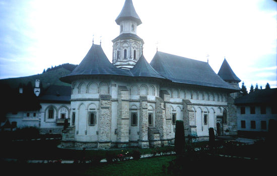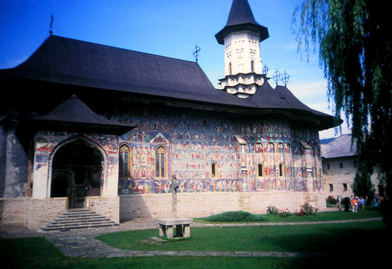 Über einen Paß geht es dann bergab ins Tal der Moldau, dem wir nun bergan folgen. Ein großes neues Best Western Hotel in Humorlui scheint nur von den Touristen zu leben, die hier die Klöster besuchen. 8 km rechts liegt das erste, Humor. Es wird von Nonnen bewohnt, eine kleine ruhige Anlage am Ende der Straße in ein Tal. Wir steigen auf den Schatzturm am Rand der Anlage und staunen über die Malereien an der Außenfront der Kirche, die zwar etwas verwaschen sind, aber immerhin 400 Jahre dem Wetter trotzen. An der Andenkenbude bekommen wir eine deutschsprachige Karte, auf der alle übrigen Klöster aufgeführt sind, mit vielen weiteren Erläuterungen, die Neugier auf weitere Klosterbesuche weckt.