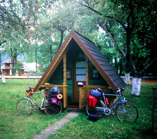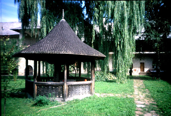 Als wir endlich beim Kloster Putna eintreffen, dämmert es schon, höchste Zeit, ein Quartier zu suchen. Das finden wir bei den Mönchen selbst. Sie haben eine große Landwirtschaft und viele Obstplantagen und ein großes Gästehaus befindet sich im Bau. Wir mieten eine kleine Holzhütte von 2,20 Meter Länge, in die gerade einmal zwei Betten und unsere Rucksäcke hineinpassen, für 200000 Lei (5,30 Euro). Waschräume sind am anderen Ende des Obstgartens, aber ohne Duschen. Doch der Pope verspricht uns, dass wir abends um 20.30 Uhr in einem Anbau des Gästehauses duschen könnten, das Wasser müsse nur erst warm werden. Nun können wir uns sogar noch den Innenhof des riesigen Klosters ansehen, den Strom zum Anstrahlen der Kirche bei Nacht spart man sich aber, die ganze Anlage wird statt dessen um 20 Uhr geschlossen. Die Dorfkneipe verfügt sogar über eine Speisekarte, allerdings nur in Rumänisch, und wir staunen, was für ein gutes Essen wir für wenig Geld bekommen.