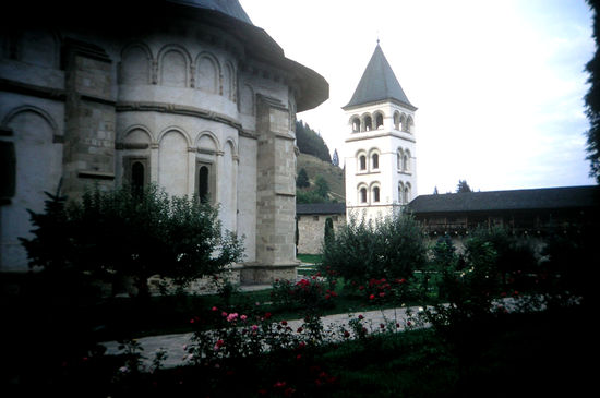 Schon nach einer halben Stunde sind wir beim Kloster Sucevita, das in noch schönerer Umgebung liegt, noch größer ist und noch besser erhalten. Auch hier besichtigen wir alles, aber jetzt schon mit etwas fachkundigerem Blick. Rot ist hier der Grundton der Außenmalereien.