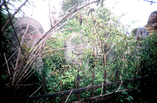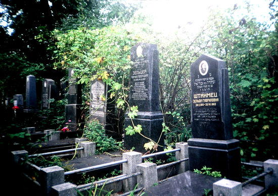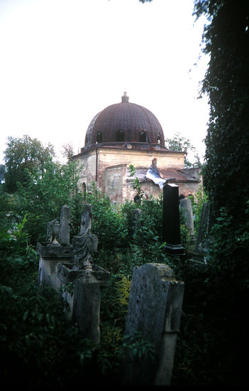 Dieser jüdische Friedhof ist unser erstes Ziel. Hinter einem plattgewalzten Zaun entdecken wir überwucherte Grabsteine, nach dem Stadtplan müßten wir hier richtig sein. Doch wir sind nicht ganz sicher, viele Steine sind kyrillisch beschriftet und zeigen eingravierte Bilder der Verstorbenen, und nicht alle Todesdaten liegen vor 1945. Doch als wir tiefer in die Wildnis eindringen - selbst die Friedhofswege sind so zugewachsen, dass wir die Räder nicht durchschieben können, finden wir pompöse Familiengruften neben einfachen Grabmälern, die immer die Schlußverse gemeinsam haben: Friede seiner/ihrer Asche, teils lateinisch, teils hebräisch.