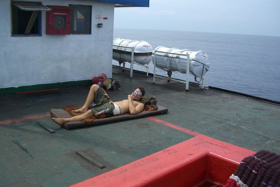 Die einen chillen die anderen fischen (wobei dies auchg nicht gerade besonders anstreengend war). Waehrend der Ueberfahrt waren die Faehrejungs denn acuh ziemlich erfolgreich und haben ein paar Prachtsexemplare an Land gezogen und deponierten diese gleich neben dem hygienischen Faehrenklo...