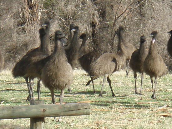 Im Wald sind mir Emus ueber den Weg gelaufen. Emus sind total emanzipiert: die Emu-Weibchen ueberlassen den Emu-Maennchen die frisch gelegten Eier, die diese ausbrueten und dann den Nachwuchs aufziehen.