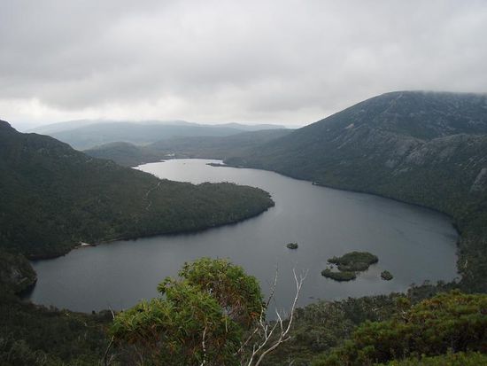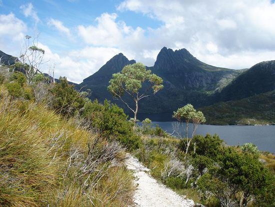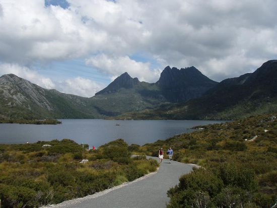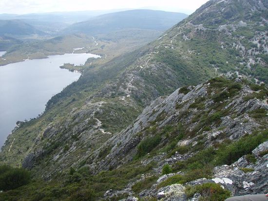 Tag 3 war dann der grosse Wandertag. Wir sind in den Cradle Mountain National Park gefahren, um dort ein paar Anhoehen zu erklimmen. Die Wegbeschreibung besagte, unsere Route sei "steep, rocky and rough". Ich weiss jetzt: die Australier uebertreiben nicht. Kein versicherungsschutzbedingtes Ausformulieren von akzeptablen Wegbedingungen. "Steep, rocky and rough" heisst einfach auch genau das, naemlich aufpassen und schauen, wo man langtappt.