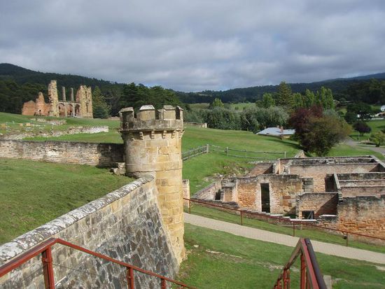 Den naechsten Tag gab es mal was Historisches: eine Tour durch Port Arthur. Ihr wisst sicher, dass am Anfang nur verurteilte Kriminelle nach Australien kamen. Wenn sich da dann jemand daneben benommen hat, kam der nach Tasmanien, das zu der Zeit Van Diemens Land hiess. Und Port Arthur war dort das schlimmste aller Gefaengnisse. Das Meer und der Wald waren natuerliche Grenzen, so dass man keine Gefaengnismauern im eigentlichen Sinne brauchte.