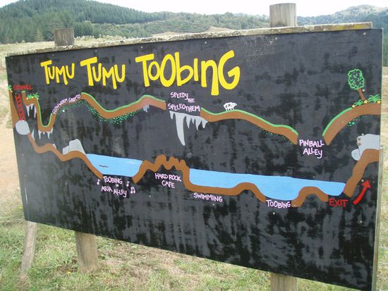 Und wieder gings weiter zur naechsten Stadt: nach Waitomo zum Caving, genauer zum Tumu Tumu Toobing. Dabei zieht man sich laecherlich aussehende Wetsuits an, Gummistiefel und Helm, und dann gehts ab in die Hoehle. Irgendwie hatte ich praepartierte oder ausgetretene Wege erwartet, die man langtappt, aber weit gefehlt. Wir mussten schlammige Pfade entlangschlittern, ueber Felsen klettern, nach Halt suchen, durch huefthohes Wasser waten und streckenweise schwimmen. Es war trotz Wetsuit ganz schoen kalt. Aber als wir dann, wie an einer Kette aufgereiht, bei vollstaendiger Dunkelheit in Gummiringen sassen und die Gluehwuermchen ueber uns wie Sterne funkelten, war das schon die ganze Muehe wert.