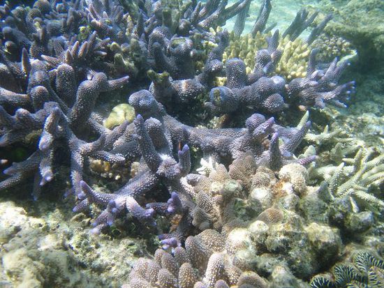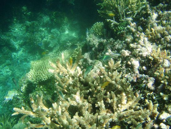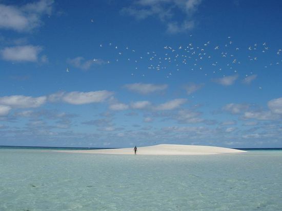 Nach drei Stunden wackeliger Fahrt uebers Meer hatten wir 90km vom Festland entfernt unser Ziel erreicht: vor uns tat sich das Great Barrier Reef auf. Das erste, was wir erkennen konnten, war eine weisse Sandinsel mitten im Meer, die von einem Vogelschwarm bewohnt wurde. Was soll ich sagen: ich habe noch nichts gesehen, was mehr die Bezeichnung "ein kleines Stueck Paradies" verdient haette.