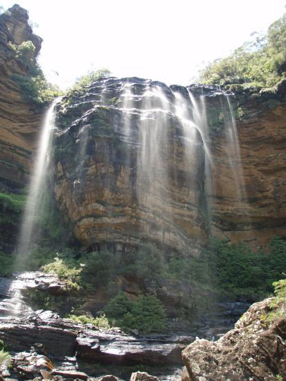 Wenn man in der Stadt ist, kann man leicht vergessen, wo man sich eigentlich befindet. Erst wenn man rausfaehrt wird ploetzlich klar, dass man in Down Under ist. Die Natur ist hier ganz anders. Die Waelder der Blue Mountains bestehen hauptsaechlich aus Eukalyptusbaeumen, es riecht also die ganze Zeit nach Hustenbonbons. Der Eukalyptus ist auch dafuer verantwortlich, dass man von weitem den Eindruck hat, der Wald waere blaeulich gefaerbt, deshalb Blue Mountains. Wir haben Kaenguruhs gesehen und haben eine dreistuendige Wanderung gemacht, mit vielen Wasserfaellen und toller Aussicht; macht Euch selbst ein Bild davon!