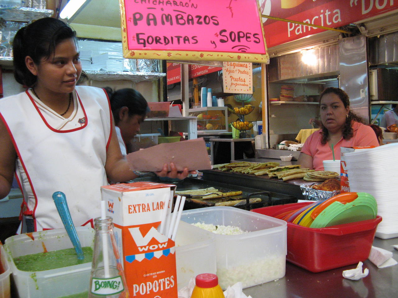 kleiner markt in villa coapa mit essensstaenden. hier auf dem bild: quesadillas (gebackene oder gebratene tortillas mit kaese gefuellt)